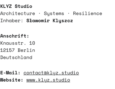 Diese Website enthält Links zu externen Websites Dritter. Auf deren Inhalte hat KLYZ Studio keinen Einfluss; daher wird für diese fremden Inhalte keine Haftung übernommen. Für die Inhalte der verlinkten Seiten ist stets der jeweilige Anbieter verantwortlich.